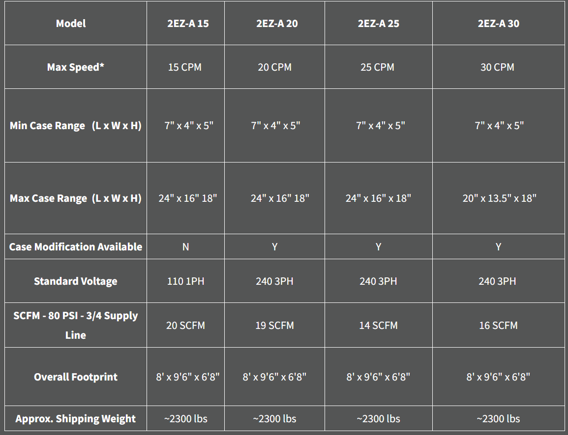Application Flexibility. Choose from models capable of 15–30 cases per minute in a broad range of case sizes. Plus, a breakthrough design that allows speed to be easily upgraded in the field, avoiding the cost and floor space of purchasing a new machine.