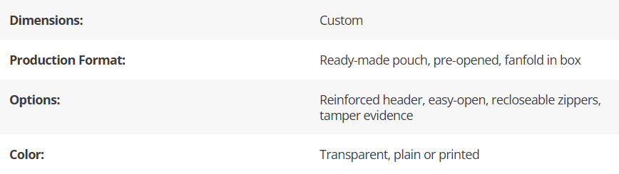 These versatile packaging options come in a range of gauges and material configurations that can be food grade and include barrier properties, added stiffness, gloss or matte finish.